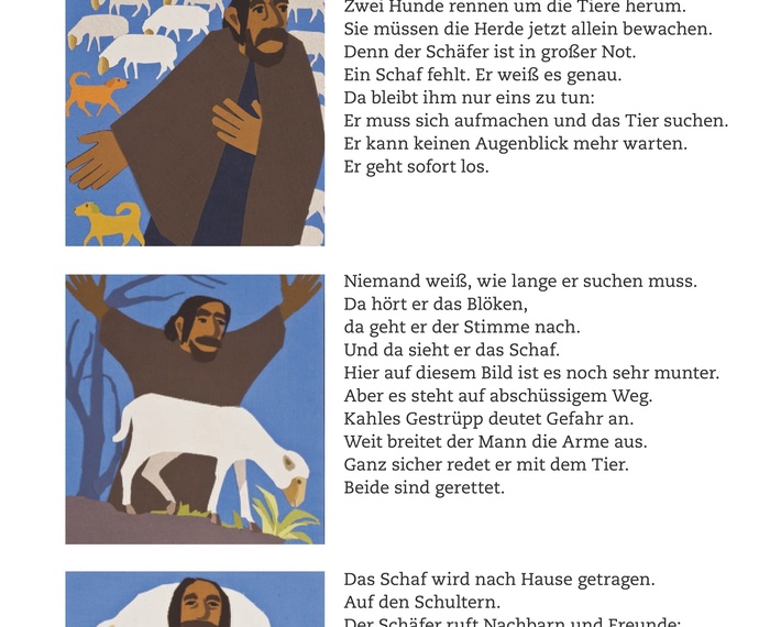 So werden ihre Bilder zu theologisch verantworteten Bildpredigten. In den begleitenden Texten erläutert sie sowohl die inhaltliche Aussage als auch die gestalterischen Besonderheiten. Manche Bildmotive gestaltet sie mehrfach, wobei sie mit Farbgebung und Bildaufbau experimentiert. Daher deckt sich die Beschreibung nicht immer in allen Details, wohl aber in der Grundaussage mit dem jeweiligen Stoffbild.